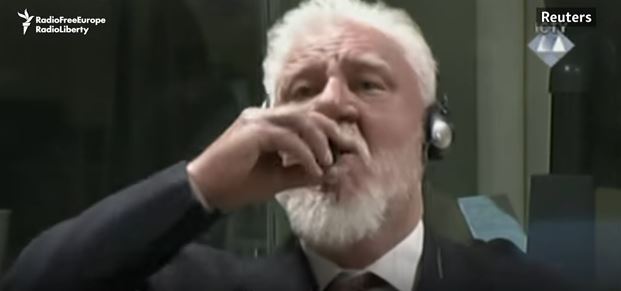 Slobodan Praljak, 72 ans, a crié "Praljak n'est pas un criminel" avant de sortir une fiole de sa poche et d'en avaler le contenu devant les caméras. Alors que des responsables du tribunal s'affairaient autour de Praljak, le juge président Carmel Agius a immédiatement ordonné la suspension de l'audience et les rideaux entourant la salle du tribunal ont été tirés.