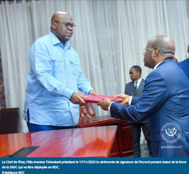 Le Chef de l’Etat, Félix-Antoine Tshisekedi a présidé vendredi 17 novembre la cérémonie officielle de signature par la partie congolaise, de l’Accord portant statut de la force de la SADC qui va être déployée « dans les jours à venir « en République démocratique du Congo, rapporte le compte X de la Présidence de la République.