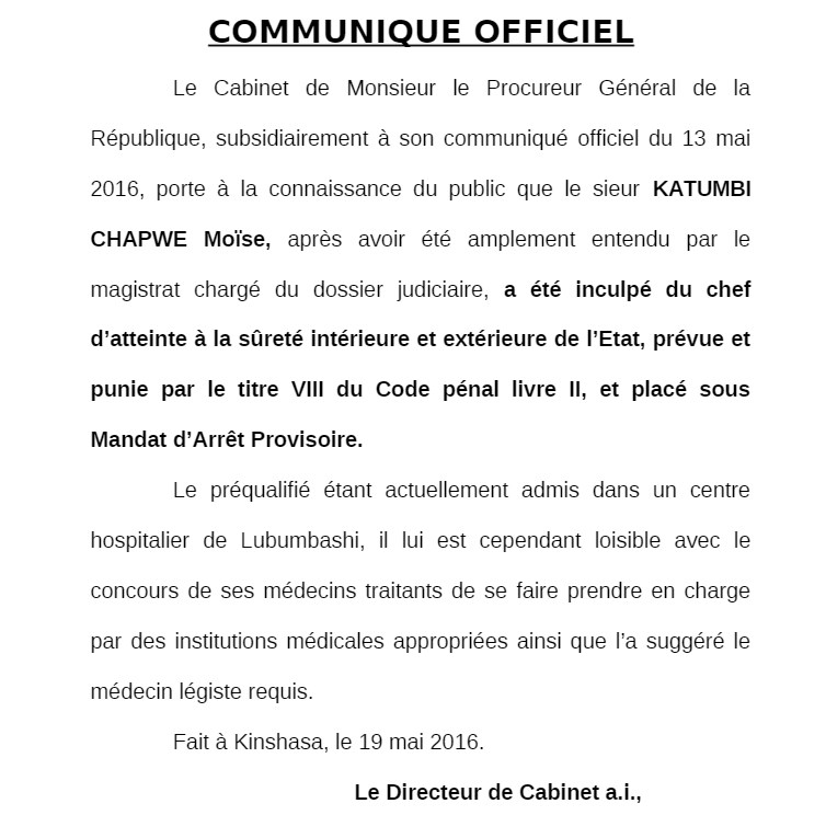Alors que le parquet général de Lubumbashi estime que Moïse Katumbi a été amplement entendu sans attendre sa troisième audition reportée à cause de son état de santé, il a décidé de l’inculper pour « atteinte à la sureté intérieure et extérieure de l’Etat » et de le place sous mandat d'arrêt provisoire. Celui-ci est soupçonné par le gouvernement congolais d’avoir recruté des mercenaires étrangers, notamment américains.