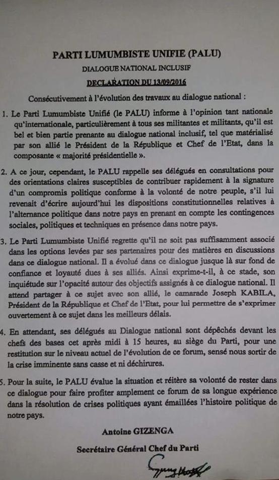 Ce grand allié de la Majorité Présidentielle pose là un acte fort. Cette formation politique chère au patriarche Antoine Gizenga se sent comme mis de côté par la MP dans les discussions officielles et officieuses autour du dialogue. C’est ici un nouveau couac dans ces pourparlers qui met Kodjo, d’une part, et, la famille politique du président Kabila, d’autre part, au pied du mur. Tout de même, le parti Lumumbiste Unifié dit rester de cœur avec le Chef de l’Etat, Joseph Kabila Kabange ainsi que la Majorité Présidentielle. Aucune date n’est fixée pour le retour au dialogue des délégués rappelés. En attendant, le Palu déclare évaluer la situation. Ci-dessous, l’intégralité de la déclaration politique du parti de Gizenga.