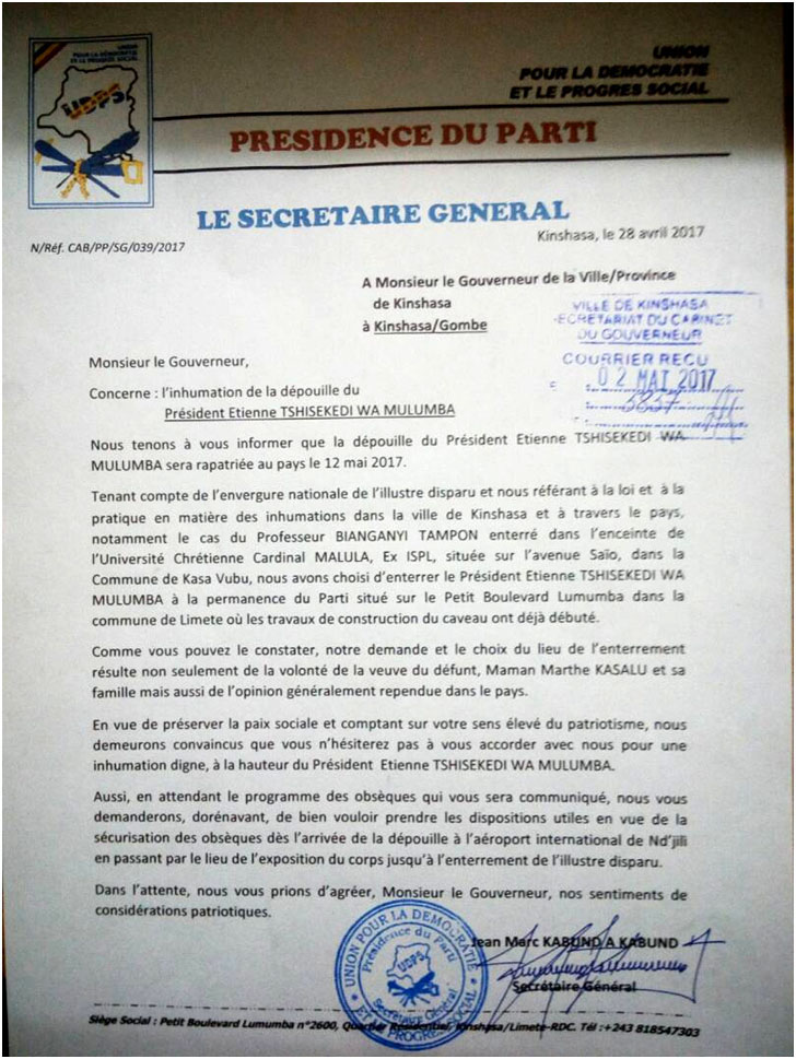 Lire, ci-dessous, la correspondance du Sg de l’UDPS au Gouverneur de la ville de Kinshasa.