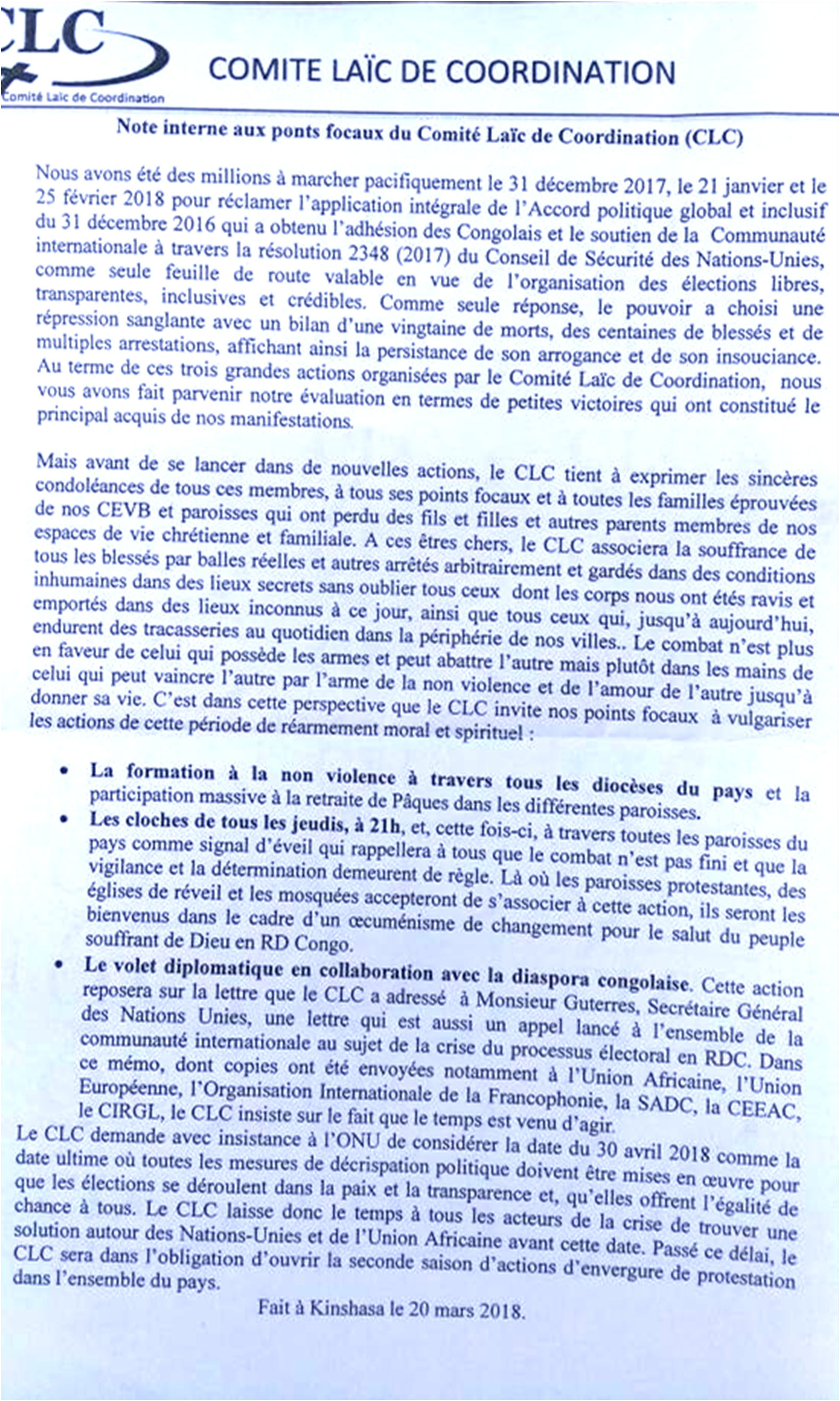 Les cloches de tous les jeudis, à partir de 21 heures, doivent également être maintenues. Et cette fois-ci, indique cette correspondance, à travers toutes les paroisses du pays " comme signal d’éveil qui rappellera à tous que le combat n’est pas fini et que la vigilance et la détermination demeurent la règle. Là où les paroisses protestantes, des églises de réveil et les mosquées accepteront de s’associer à cette action, ils seront les bienvenus dans le cadre d’un œcuménisme de changement pour le salut du peuple souffrant de Dieu en RDC ".