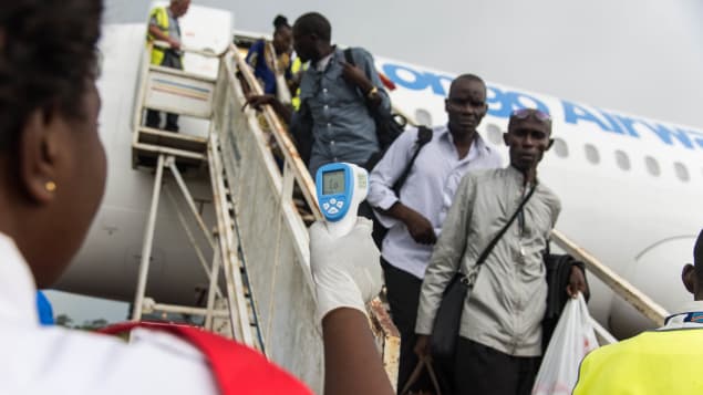 Une travailleuse de la santé utilise un thermomètre infrarouge pour détecter de possibles cas de fièvres chez les passagers arrivant à l'aéroport de Mbandaka. Photo : Getty Images/JUNIOR KANNAH