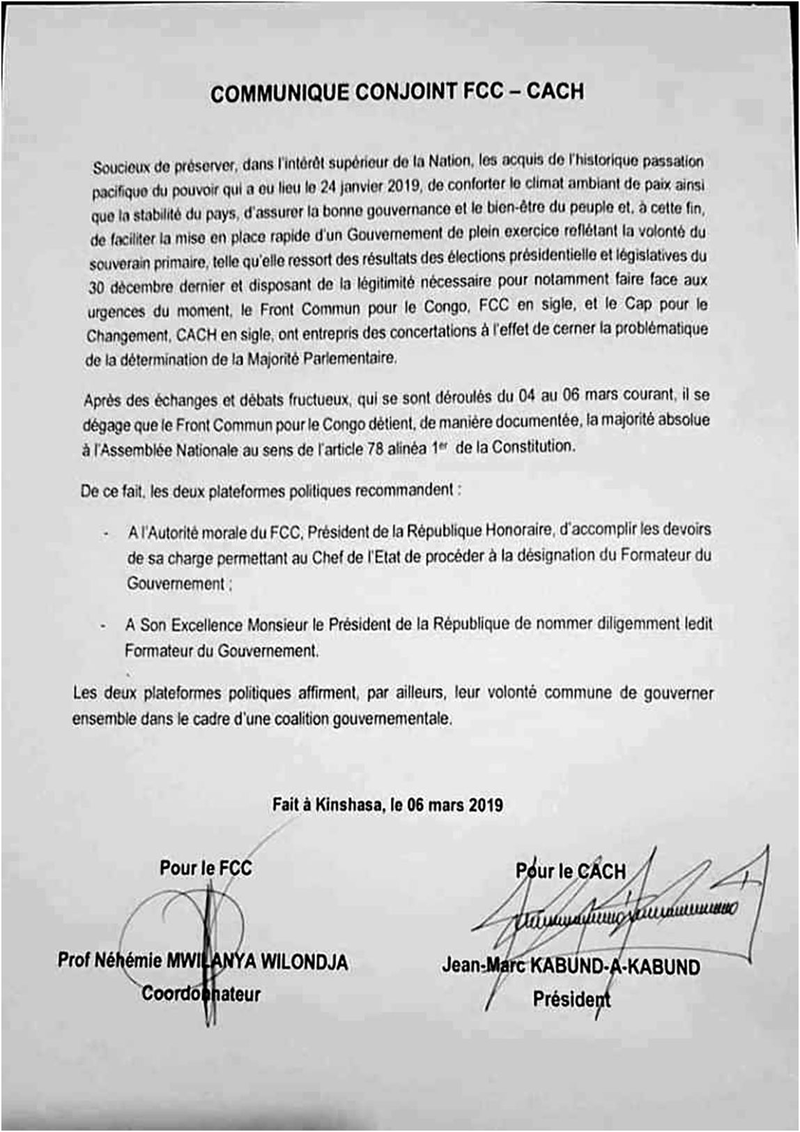C'est ce qui ressort des concertations de trois jours entre le CACH et le FCC. Plus de polémique sur la nécessité de nommer ou pas un informateur.Les plateformes politiques Cap pour le changement (CACH) et Front commun pour le Congo (FCC) ont convenu de passer directement à la nomination du formateur du Gouvernement. Tel est le principal résultat des échangesentre les ténors de ces deux regroupements politiques à Kinshasa. Les deux plateformes ont, au terme des travaux, convenu sur le fait que c'est le FCC qui détient, de manière documentée, la majorité absolue à l'Assemblée nationale, au sens de l'article 78, alinéa 1er de la Constitution. Fort de ce constat, le CACH et le FCC appellent le président Félix Tshisekedi à nommer diligemment un formateur du Gouvernement. Ils invitent en même temps l'autorité morale du FCC, le président sortant Joseph Kabila, à accomplir les devoirs de sa charge permettant au chef de l'Etat de procéder à la désignation dudit formateur. Rappelons que les deux plateformes ne se mettaient pas d'accord quant à la nécessité de nommer ou pas l'informateur. Pour le CACH, le chef de l'Etat devait désigner l'informateur en vue d'identifier formellement la majorité parlementaire au sein de l'Assemblée nationale. Cette démarche n'était pas du goût du FCC. La méga plateforme initiée par Joseph Kabila se faisait fort de démontrer qu'elle disposait de 330 députés élus lors des élections du 30 décembre dernier.Un nombre synonyme de la majorité absolue. En guise de démonstration de force, les élus nationaux FCC s'étaient rendus le dimanche 24 février dernier à Kingakati pour réaffirmer leur fidélité à l'autorité morale. C'était aussi une manière pour la Kabilie et apparentés de montrer à la ville et au monde la majorité parlementaire. Par conséquent, depuis ce jour-là, pour la famille politique du chef de l'Etat sortant, le débat sur l'informateur était sans objet. Les concertations entre les deux camps viennent donc de mettre un terme à cette polémique. Les congolais espèrent pouvoir enfin connaître le nom du chef du tout premier gouvernement de l'ère Tshisekedi.