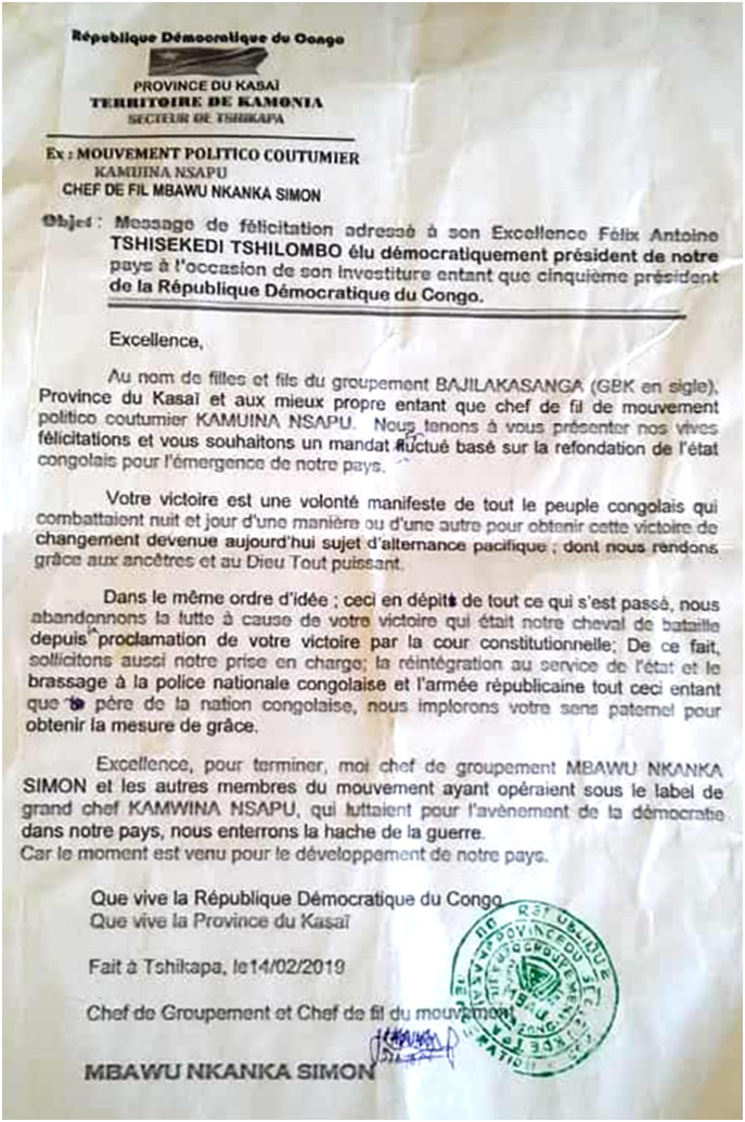 Dans une déclaration diffusée hier mercredi 6 mars, les miliciens du mouvement Kamuina Nsapu félicitent le président Félix-Antoine Tshisekedi pour sa brillante élection à la tête de la RDC. Ils implorent son sens de père de la nation afin de faciliter leur réintégration sociale et leur intégration au sein des Forces armées de la RDCongo (FARDC) et de la Police nationale congolaise (PNC). Ce mouvement insurrectionnel affirme abandonner la lutte armée à la suite de la victoire tant attendue de Félix Tshisekedi à la présidentielle du 30 décembre dernier. Il se dit prêt à contribuer au développement de la République démocratique du Congo. L’HEURE EST AU DEVELOPPEMENT DU PAYS « En dépit de ce qui s’est passé, nous abandonnons la lutte. Nous sollicitons ainsi notre prise en charge, notre réintégration sociale et notre brassage à la Police nationale et à l’armée républicaine », a écrit Mbawu Nkanka Simon, chef du groupement Bajilakasanga et chef de file dudit mouvement. Celui qui opérait sous le label du Chef Kamuina Nsapu affirme que son mouvement se battait pour l’avènement de la démocratie et de l’alternance à la tête du pays. "Puisque celles-ci sont arrivées, nous décidons d’enterrer la hache de guerre.Car, le moment est venu pour le développement de notre pays", a-t-il affirmé. Depuis l’avènement de Félix Tshisekedi à la tête de la RDC, on assiste à des vagues de rééditions des mouvements rebelles qui, aux yeux de plus d’un analyste, augurent l’avènement d’une paix généralisée à travers le territoire national congolais. VIVEMENT LA PAIX A TRAVERS LE PAYS Dans son discours d’investiture le 24 janvier dernier, le chef de l’État avait promis de ramener la paix dans le Kasaï, dans l’Est du pays, mais aussi à l’ouest, dans l’ex Bandundu où les communautés Banunu et Batende se sont affrontés mortellement à Yumbi, dans le Maï-Ndombe. Le mouvement Kamuina a été à la base de nombreuses tueries dans la province du Kasaï depuis 2016. Il revendiquait la dépouille mortelle de son chef, tué par les forces de sécurité, et se disait déterminé à déstabiliser les institutions légalement établies et conquérir le pouvoir par la force.