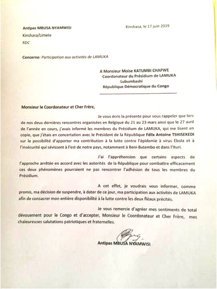La crise s’enlise au sein de la coalition « Lamuka ». Cette plateforme électorale se vide de sa substance avec les départs en cascades de ses tenors. Le dernier en date est celui dd Mbusa Nyamwisi qui souhaite aider le président de la République dans la lutte contre l’épidémie à virus Ebola et l’insécurité sévissant à l’Est du pays.