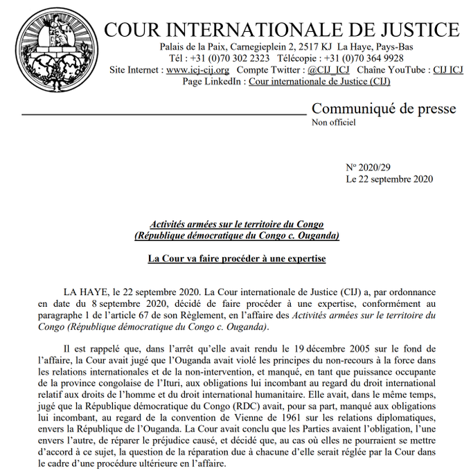La Cour international de justice (CIJ) a ordonné, mardi 22 septembre, une expertise pour évaluer les dommages de l’occupation ougandaise de l’est de la République démocratique du Congo (RDC) entre 1998 et 2003. L’Ouganda avait été condamné à payer des réparations mais faute d’accord entre Kampala et Kinshasa, la CIJ a ordonné une expertise.
