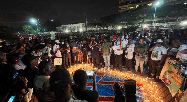 Ce devait être avant tout une manifestation de soutien aux forces armées congolaises. Les protestataires forment un cercle autour des drapeaux étalés sur les pavés. Ils se sont munis chacun d’une bougie et scandent des slogans hostiles à Kigali.