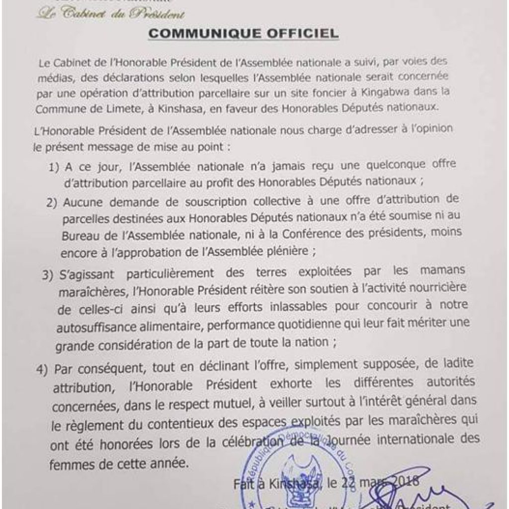 ll fallait vraiment un feedback de la part du Président de l’Assemblée Nationale, Aubin Minaku, concernant cette offre faisant état d’une attribution des parcelles à tous les Députés nationaux de la part de Joseph Kokonyangi, Ministre de l’Urbanisme et Habitat. Evidemment, la réaction du premier des Députés nationaux était tombée dans la nuit du jeudi 22 mars 2018. C’est, en effet, dans un communiqué signé par son directeur de cabinet que le speaker de la Chambre Basse du Parlement se dit non concerné par cette opération que prévoit d’entamer le chargé de l’urbanisme et habitat.