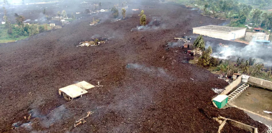 Une vue aérienne montre des débris engloutissant des bâtiments dans le village de Bushara, région de Nyiragongo, près de Goma, le 23 mai 2021. AFP - JUSTIN KATUMWA