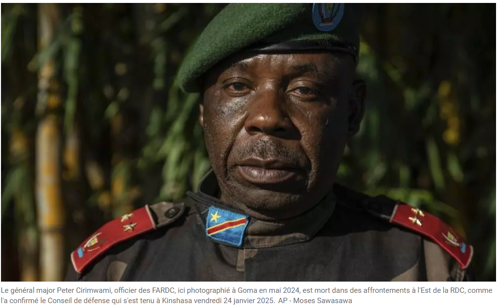 Le général major Peter Cirimwami, officier des Forces armées de la République démocratique du Congo (FARDC) et gouverneur militaire de la province de Nord-Kivu, est mort des suites de ses blessures. Il a été touché jeudi 23 janvier, alors qu'il s'était déplacé vers la ligne de front à l'ouest de Goma. Sérieusement blessé, il a été pris en charge d'abord à Goma. Puis, il a été évacué dans la nuit de jeudi à vendredi vers Kinshasa.