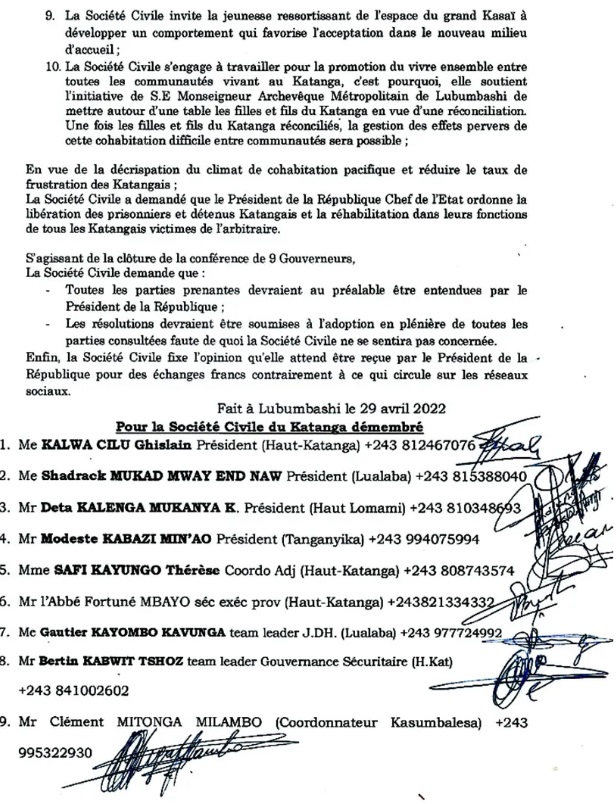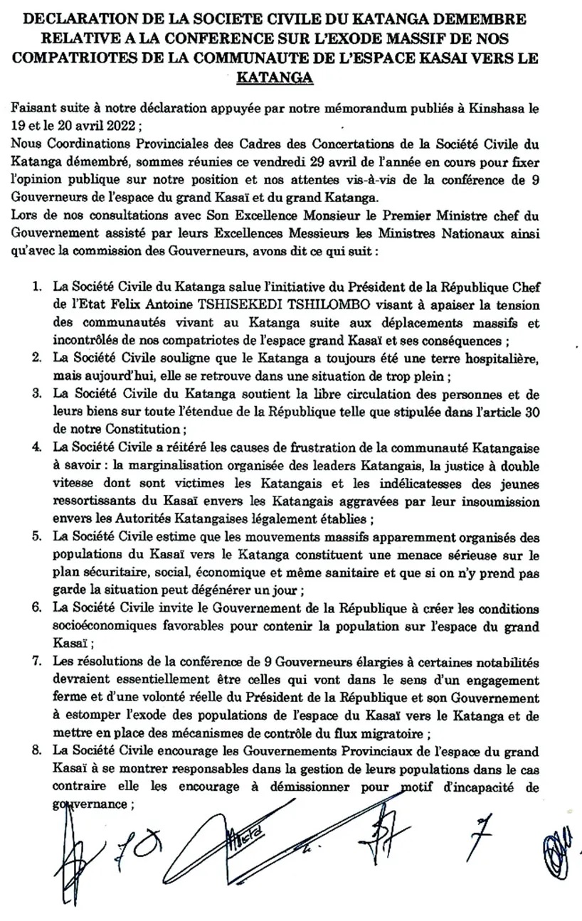 Il s’agit notamment du fait qu’ayant toujours été une terre hospitalière, le Katanga se trouve actuellement  dans une situation de trop plein ; des causes de frustration de la communauté katangaise, à savoir : la marginalisation organisée des leaders katangais, la justice à double vitesse dont sont victimes les Katangais et les indélicatesses des jeunes ressortissants du Kasaï envers les Katangais, aggravées par leur insoumission envers les autorités katangaises légalement établies ; la menace sérieuse sur les plans sécuritaire, social, économique et sanitaire que constituent les mouvements massifs apparemment organisés des populations du Kasaï vers le Katanga… Kléber KUNGU